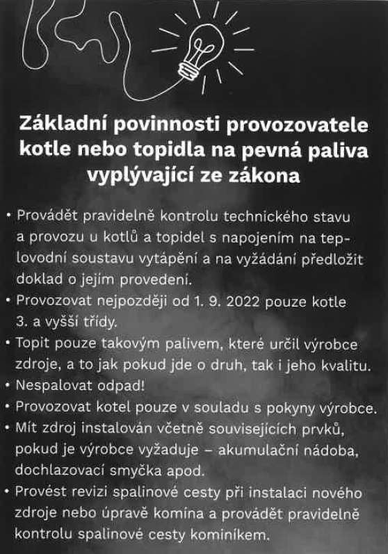 Základní povinnosti provozovatele kotle nebo topidla na pevná paliva vyplívající ze zákona.