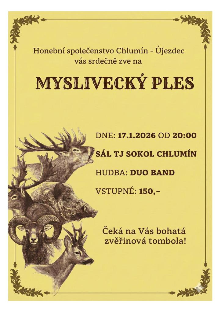 Honební společenstvo Chlumín – Újezdec Vás zve na MYSLIVECKÝ PLES, který se koná v sobotu 17. ledna 2026 od 20:00 hod., a to ve společenském sále na hřišti TJ Sokol Chlumín. K tanci a poslechu zahraje kapela DUO Band. Těšit se můžete i na bohatou zvěřinovou tombolu. Vstupné je 150 Kč.